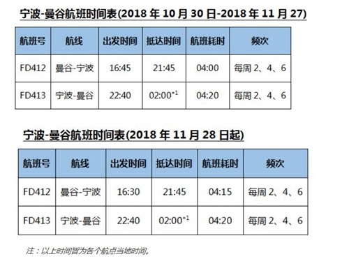 10月30日-11月27期間,曼谷-寧波的航班號是FD412,16:45出發(fā),21:45抵達(dá),耗時4小時;寧波-曼谷的航班號是FD413,22:40出發(fā),02:00+1抵達(dá),飛行時長4小時20分;從11月28日起,曼谷直飛寧波的航班時間略有調(diào)整,航班號FD412曼谷-寧波從16:30出發(fā),21:45寧波,耗時4小時15分鐘,而寧波直飛曼谷不變。