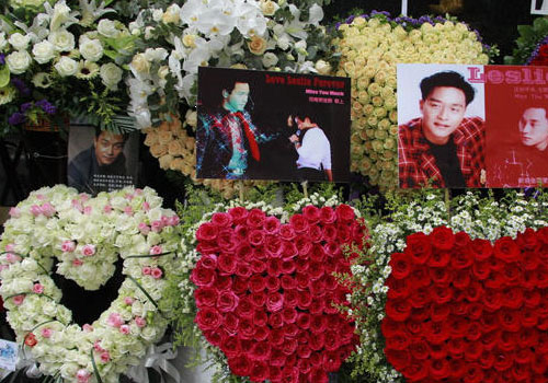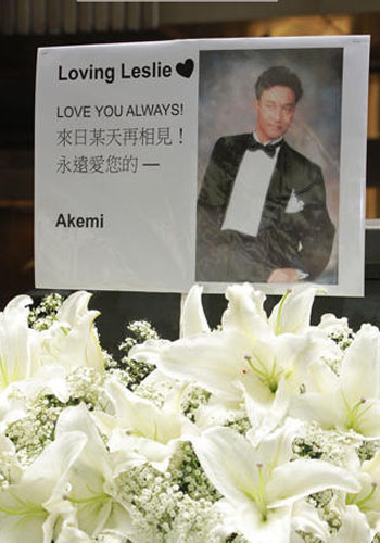 文華酒店外有數(shù)個(gè)心型花圈都是由忠實(shí)哥迷所贈(zèng),并在花牌上寫下點(diǎn)滴思念字句,吸引不少市民和游客圍觀,而一些專程由海外來(lái)港的哥迷在故地悼念偶像時(shí),亦忍不住淚灑當(dāng)場(chǎng)。