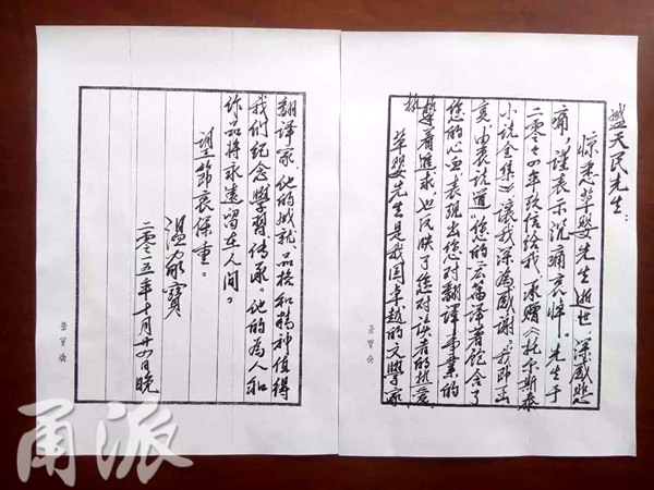 “這封信是昨晚溫總理在看到網(wǎng)絡(luò)媒體報(bào)道后,主動寫的。今天上午他的辦公室先傳真到北京的中國翻譯家協(xié)會,翻譯家協(xié)會在中午12點(diǎn)用微信發(fā)到家屬的手機(jī)上的。信函原件將通過中國翻譯家協(xié)會寄到上海市文聯(lián),再轉(zhuǎn)交給家屬。”方之岡告訴甬派記者,草嬰從事翻譯工作數(shù)十年,翻譯了列夫·托爾斯泰的全部小說作品,他的翻譯作品曾多次被國家領(lǐng)導(dǎo)人作為國禮,在出訪時送給外國元首。